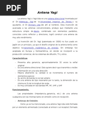 Es una antena direccional inventada por el dr. Las antenas yagi no son tan direccionales como las antenas parabólicas pero son más directivas que las antenas panel. Sólo algunos tipos de antenas como las yagi están afectadas por esta característica. Patrón de radiación ancho de banda directividad anchura del haz polarización.
