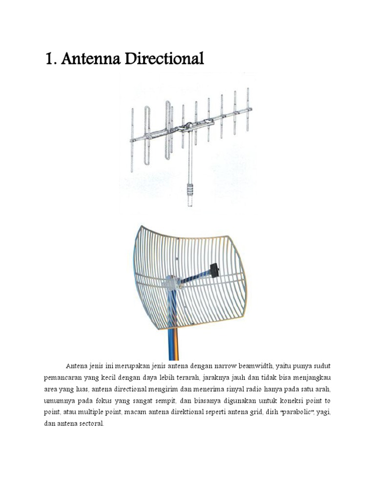 Antena terarah menghasilkan penguatan sinyal yang lebih besar dibandingkan denganantena omni jika keduanya memiliki efisiensi yang sama dan menerima sinyal dengan kekuatan yang sama. Aplikasi antena terarah digunakan untuk mengirimkan gelombang elektromagnetik ke penerima tetap mis. Cari produk penguat sinyal lainnya di tokopedia. Contoh antena directional adalah seperti antena satelit parabola wajan bolic grid yagi antena sectoral dan sebagainya.
